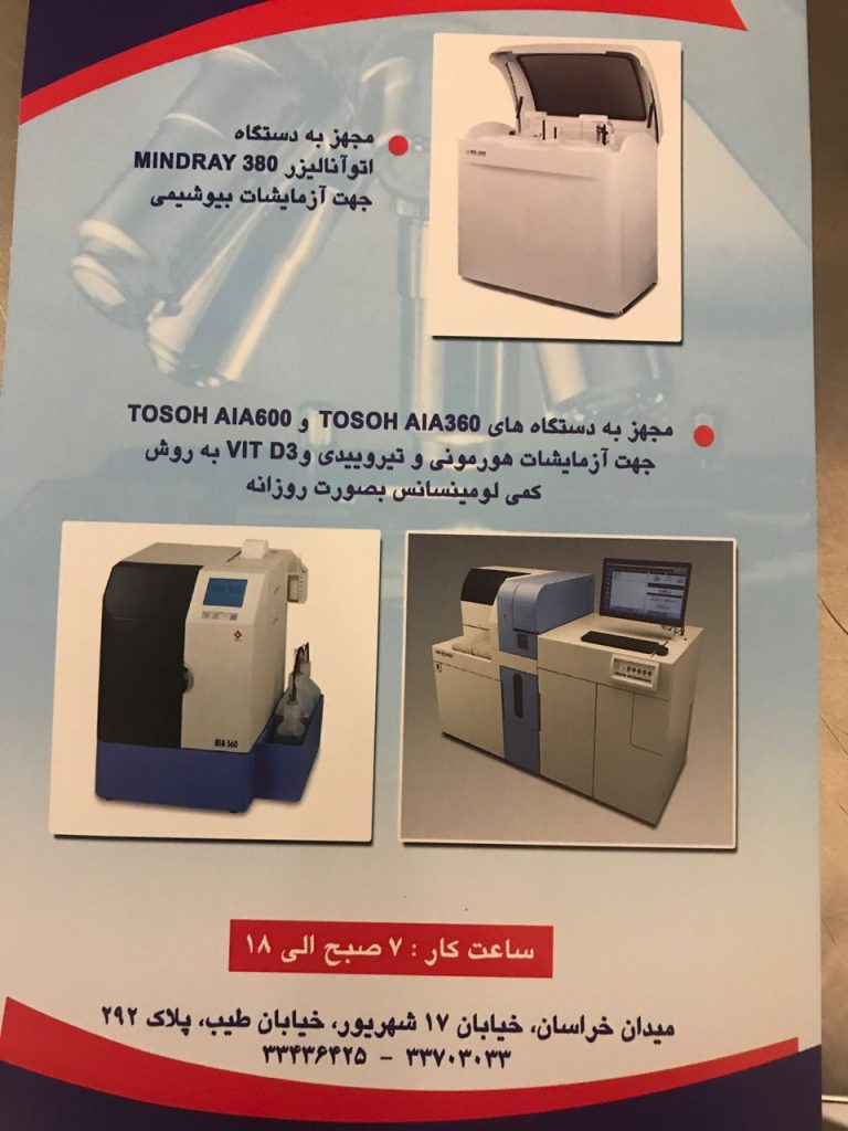 مجهز به دستگاه های TOSOH AIA360 و TOSOH AIA600 جهت آزمایشات خورمونی و تیروئیدی و Vitamin D3 به روش CLIA به صورت روزانه
